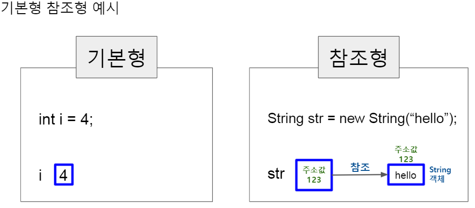 - str 변수 앞에 기본형 타입이 아닌 String클래스가 적혀있다.