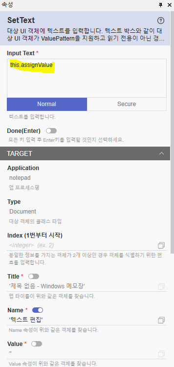여기에서는 값을 넣고자 하는 값을 Assign카드에서 this.assignValue 라는 변수로 받았으므로, Input Text에 this.assignValue 를 넣어준다.