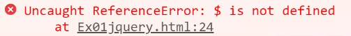 이와같이 라이브러리를 넣어주지 않고 jQuery를 사용하면 이와같은 이와 같은 오류가 난다.