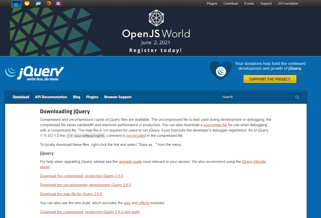 - jQuery는 Javascript 라이브러리이므로, .js형태로 존재한다.