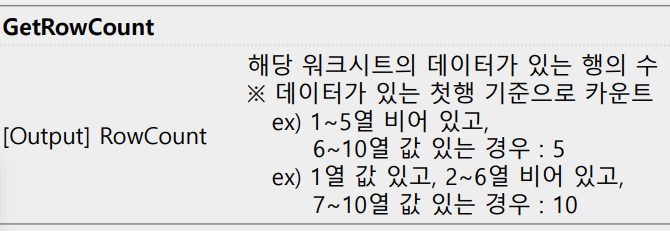 - GetRowCount - 해당 워크시트의 데이터가 있는 행의 수를 카운트 해준다.