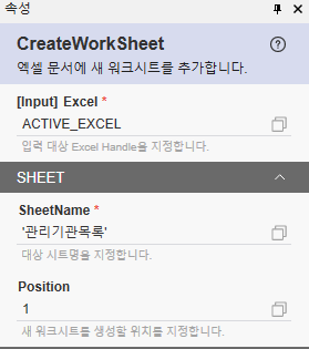 - SheetName에 생성할 워크시트의 이름 또는 변수를 입력하세요.