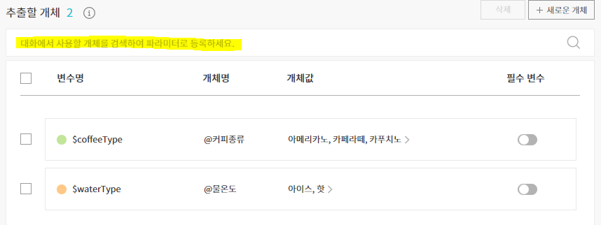 * 개체는 대화 시나리오 진행 중, 필요한 단어를 추출하는데 사용된다.