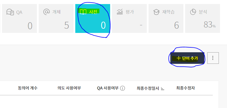 개체명을 입력한 후, 개체값에 사전 불러오기로 이전에 등록해 둔 동의어를 가져다 쓸 수 있다.