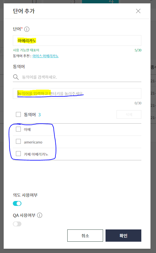 대표 단어를 지정한 후, 그 단어와 동의어 처리를 할 단어를 입력하여 사전을 생성한다.