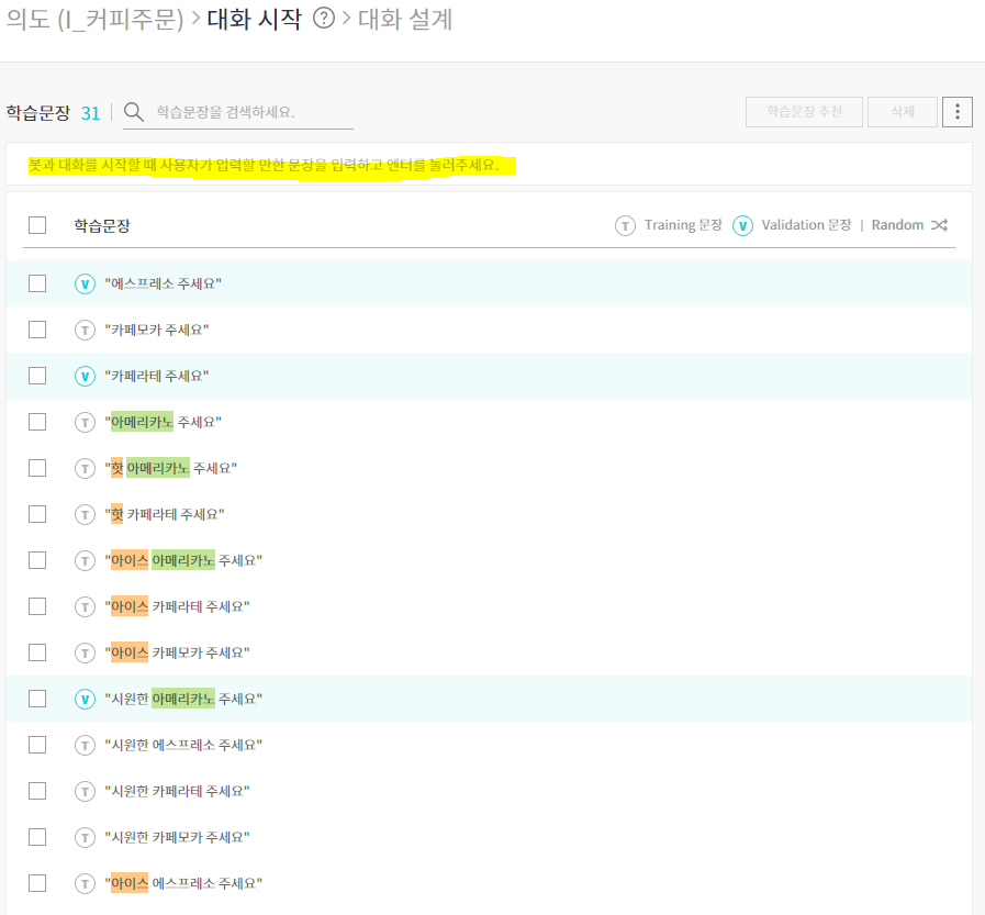 - 대화문이 있는 것은 의도로 생성하여 학습문장을 지정해준다