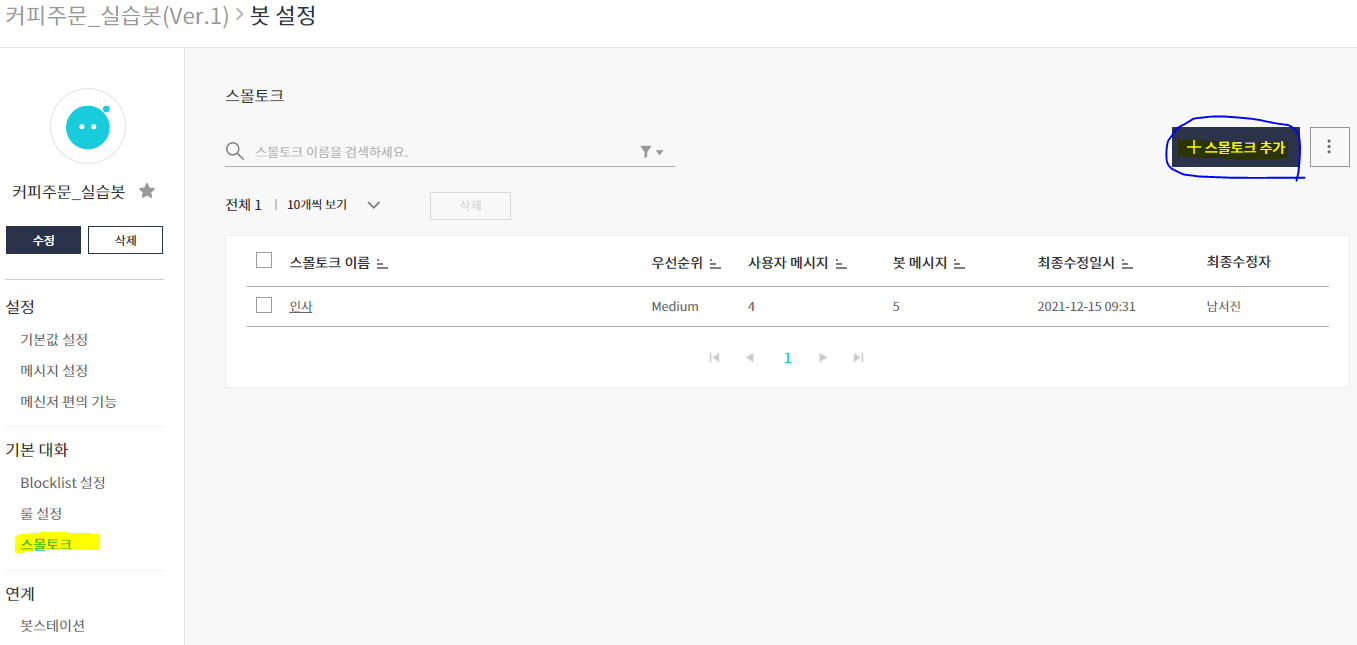 스몰토크 추가 클릭 후 원하는 스몰토크 이름과 사용자 메시지, 봇 메시지를 지정해준다