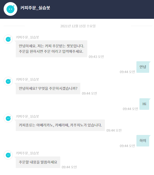 -> 지정해준 사용자 메시지에 지정해준 사용자가 내용을 입력하면, 봇이 봇 메시지에 지정된 문장 중 하나를 랜덤으로